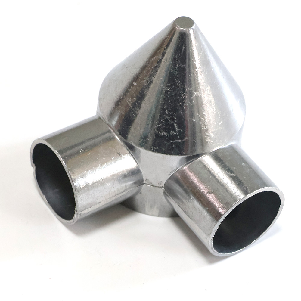 The 2" Two-Way Aluminum Bullet Cap Die connects a 1 3/8" top rail from two directions to a 2" (1 7/8" OD Actual) chain link fence terminal posts.