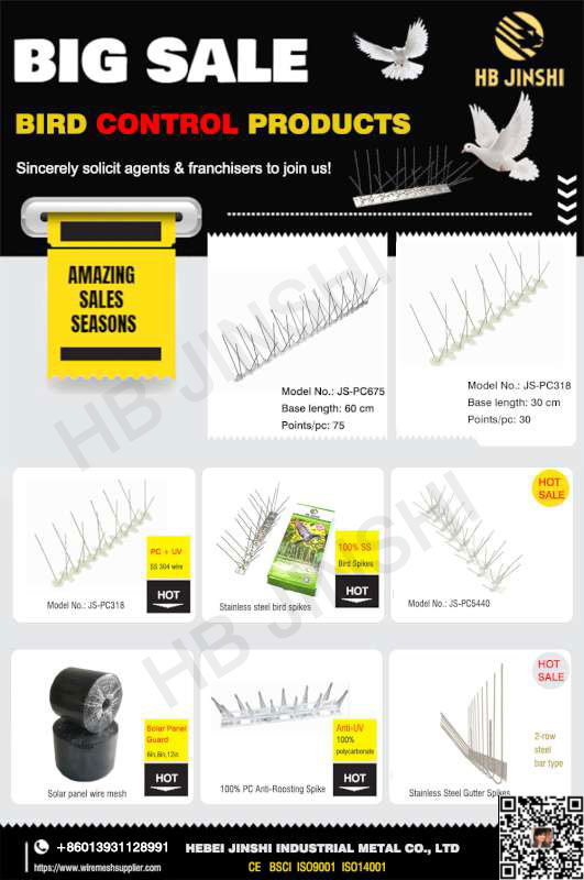 Hebei JinShi Industrial Metal Co., Ltd. ndi kampani yopanga ndi kugulitsa zinthu zachitsulo, yomwe ili m'chigawo cha HeBei, China. Ndipo inakhazikitsidwa ndi wamalonda Tracy Guo mu 2008. Ganizirani za "chitetezo cha chilengedwe" ndi "Chitani bwino nyama, khalani mogwirizana!". Tidadzipereka ku R&D yazinthu zowongolera mbalame. Makamaka kuphatikizazitsulo zosapanga dzimbiri mbalame spikes pa PC maziko,100% zosapanga dzimbiri mbalame spikesndi100% polycarbonate mbalame spikes, ndi zina.
