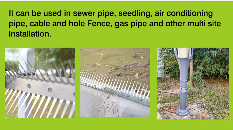 Anti Climb Spikes for more animals, such as mouse, cat, weasel, snake climbing. We used high quality Stainless steel plate to make. It’s high toughness, can be bent and adjusted an will, easy to install. It can be used in sewer pipe, seedling, air conditioning pipe, cable and hole fence, gas pipe and other multi site installation.